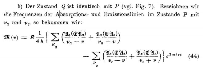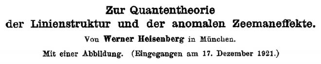先岔开个话题。杂志Zeitschrift für Physik在1924年就只在12月出版了一期,即26卷1期。这期杂志是人类学术创造浓度的顶峰,与之可相比拟的,大概只有1918年的哥廷恩大学的学报。在Zeitschrift für Physik26(1)上,不仅有玻恩创立“量子力学”一词的文章,海森堡的两篇文章,还有玻色的、实为爱因斯坦翻译成德语的Plancks Gesetz und Lichtquantenhypothese(普朗克分布律与光量子假说)一文(此文带出玻色统计),W. Bother & H. Geiger关于BKS理论的文章,费米论量子态概率的文章,W. Bothe关于光电效应的两篇文章,W. Schottky & von Issendorff关于热发射问题的文章,W. Gerlach & A. C. Cilliers关于原子磁矩的文章,J. Frenkel关于光吸收的文章,W. Gerlach关于法拉第效应的文章,Otto Hahn & Lise Meitner关于镭放射β射线的文章,Lise Meitner关于原子裂变放射γ射线的文章,E. Grüneisen & E. Goens的金属晶体研究,等等,都是影响了后续科学发展的工作,Otto Hahn & Lise Meitner的工作甚至改变了人类社会的进程。海森堡的论离子形变的文章是对此前与玻恩合作的同名文章的延续,而“量子论形式规则在反常塞曼效应问题上的改动”一文应被看作量子力学发展史上至关重要的一篇。