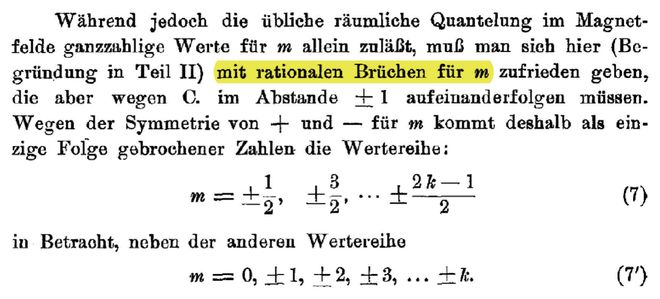 接下来,海森堡要确立外电子的稳态轨道。第一量子条件是 ,其中m是在线系中出现的总量子数(Gesamtquantenzahl,它确定线系的极限);第二量子条件是 ,其中p是角动量,与方位角β是一对共轭量,n*是角动量量子数,与线系之分蘖(记为s, p, d…)有关。结论是对于基轨道(1s),以及每一个(ms),由 可得量子数 。假设原子实的角动量在激发态也不变。若在线系公式中出现的量子数m总是一个整数,那径向量子数(radiale Quantenzahle)就只能是 ,则量子数m 的最小值总是 。可见,量子数m的最小值就是常规的方向角量子数n,则有 。这样,可得如下原子的模型:原子实的角动量为,外部电子的角动量为。这两个角动量是如何相对取向的呢?再利用索末菲的空间量子化要求,得到对于双线情形的原子模型,这两个角动量要么同向,要么完全反向,即总角动量为 和 。海森堡由此得到一个关于双线结构之本质的假说,进而用于解释反常塞曼效应:m*→m*跃迁对应谱线的π-部分,m*→m*+1跃迁对应谱线的σ-部分(Daß der Übergang m*→m* π-Komponenten , der Übergang m*→m*+1 σ-Komponenten erzeugt)。