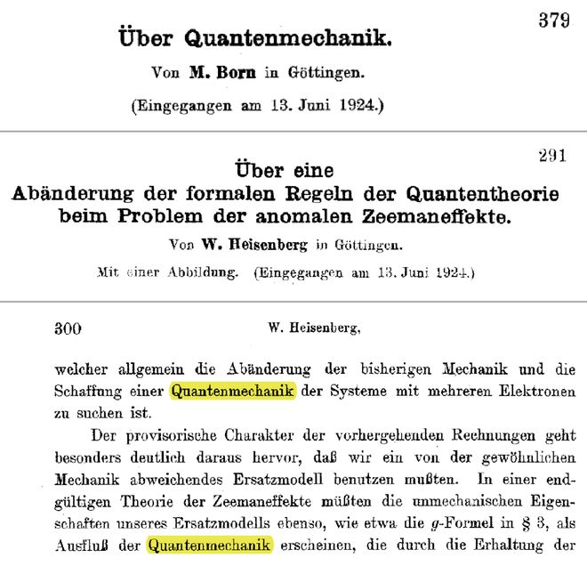 海森堡的“量子论形式规则在反常塞曼效应问题上的改进”一文,愚以为可看作是对玻恩构建“量子力学”计划的第一响应,文中提到Quantenmechanik名词形式4次,形容词形式两次。玻恩的文章和海森堡的文章的杂志收稿日期相同,为1924年6月13日。文章的投稿时间应该也不会有什么差别,因为玻恩本人是主编而海森堡是他的助手。文章构思期间,海森堡在玻恩门下学习,考虑到玻恩此前讲授Atommechanik(原子力学)并出版了专著来看,Quantenmechanik一词为玻恩提出应属无疑。从海森堡的文章也用到了Quantenmechanik一词来看,玻恩就他预期应该有的Quantenmechanik这门学问而言,和海森堡是有讨论的。笔者未见科学史家注意到海森堡在同一期杂志上的文章即使用了Quantenmechanik一词这个事实(图6)。